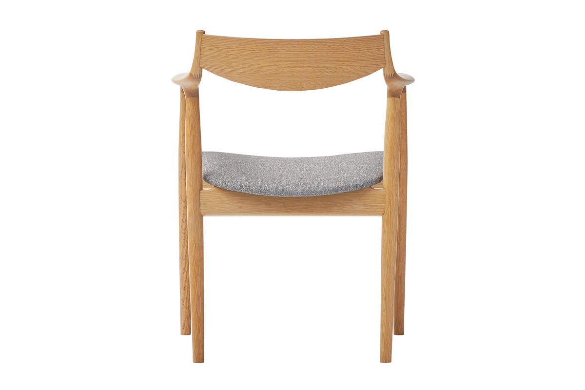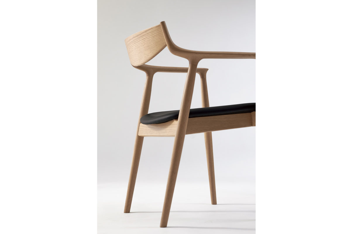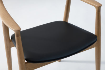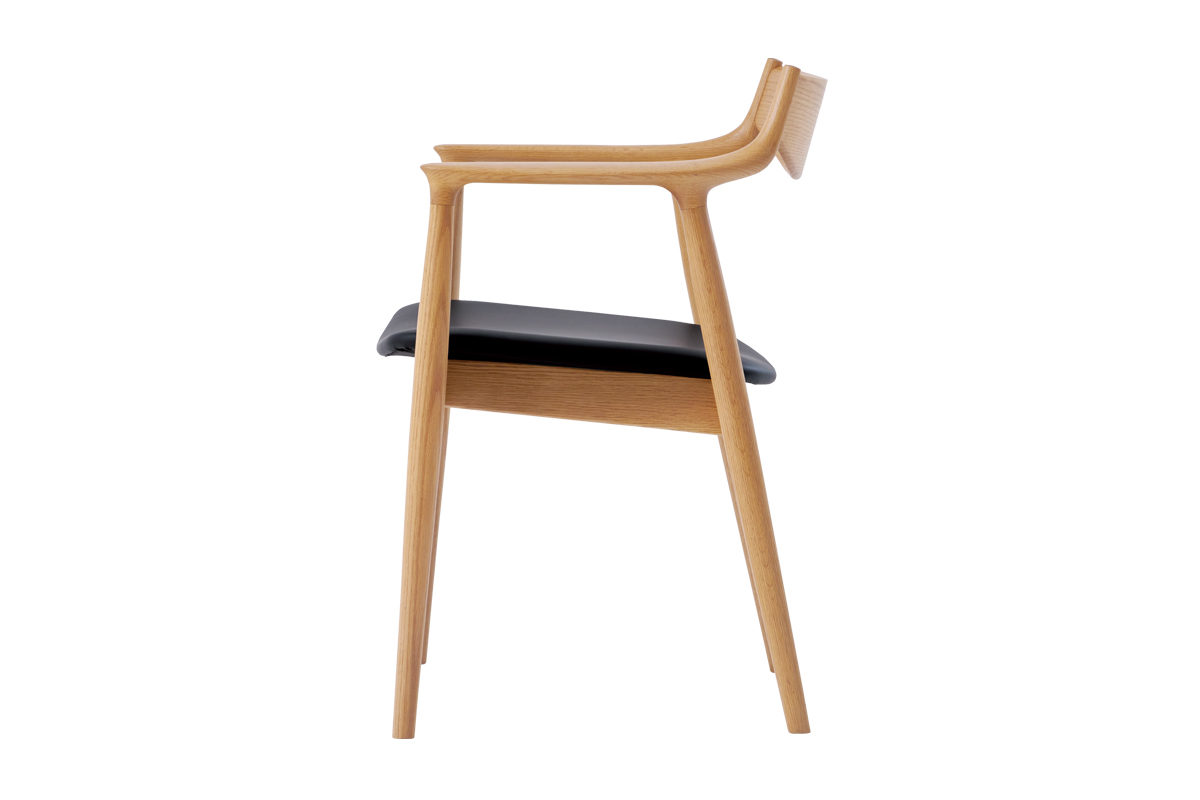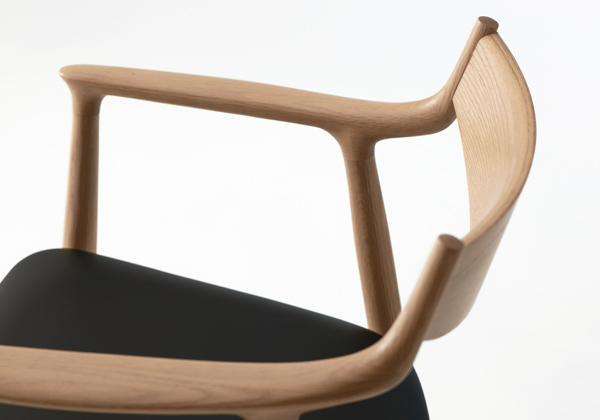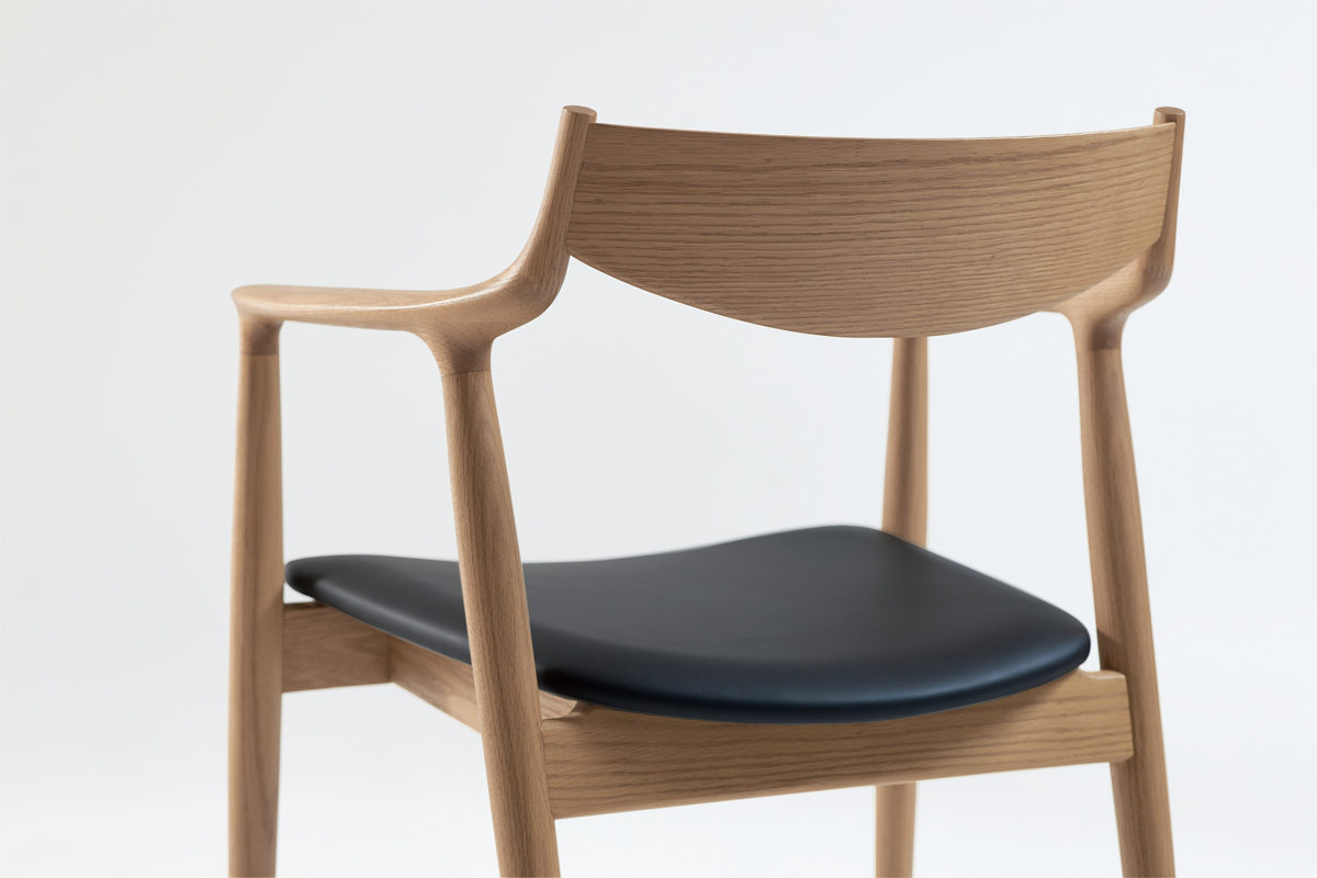 曲木加工を施した背板、複雑な曲面の形成からなる有機的な肘形状など、浜本工芸の職人の高い技術を活かしたクラフトマンシップを感じるダイニングシリーズが完成しました。チェアの肘部は腕と肘をしっかり支えるフルアーム仕様で長時間の食事やくつろぎのひとときでも快適な座り心地を実現。掴みやすく立ち座りもスムーズに行え、日常の動作を自然にサポートします。