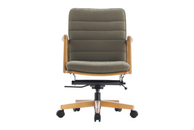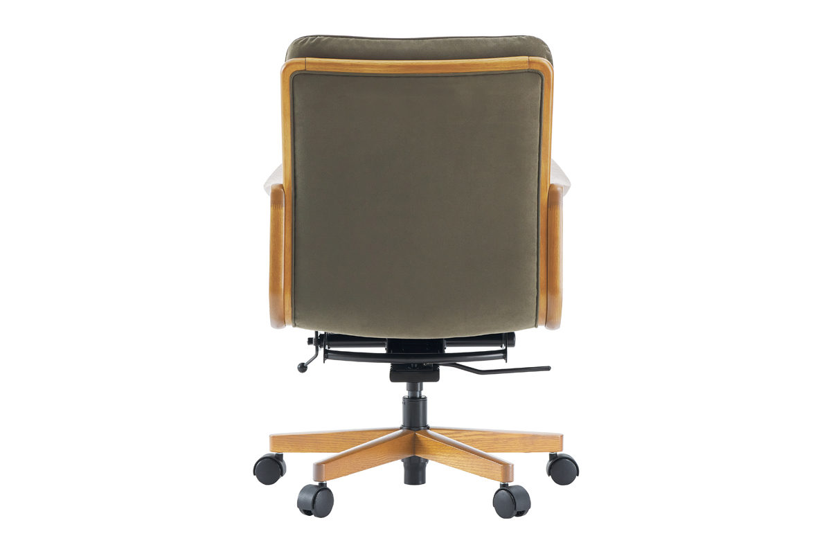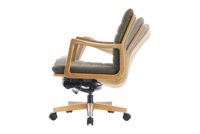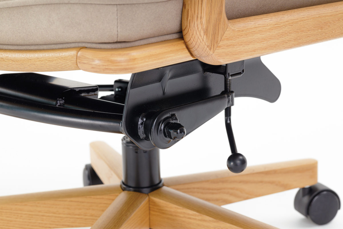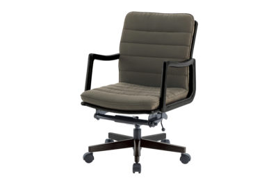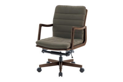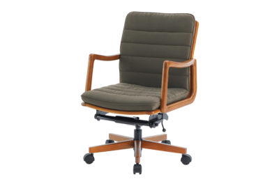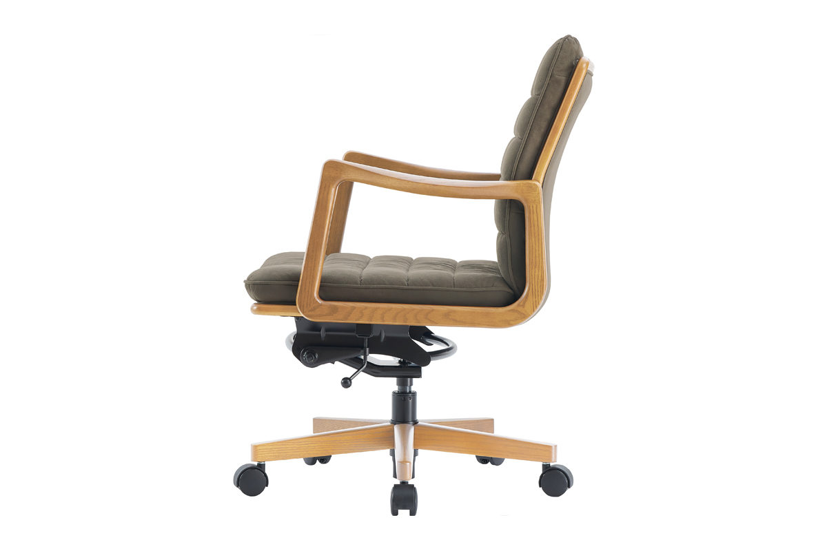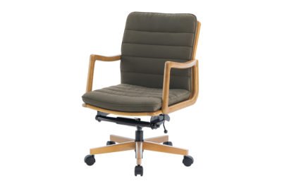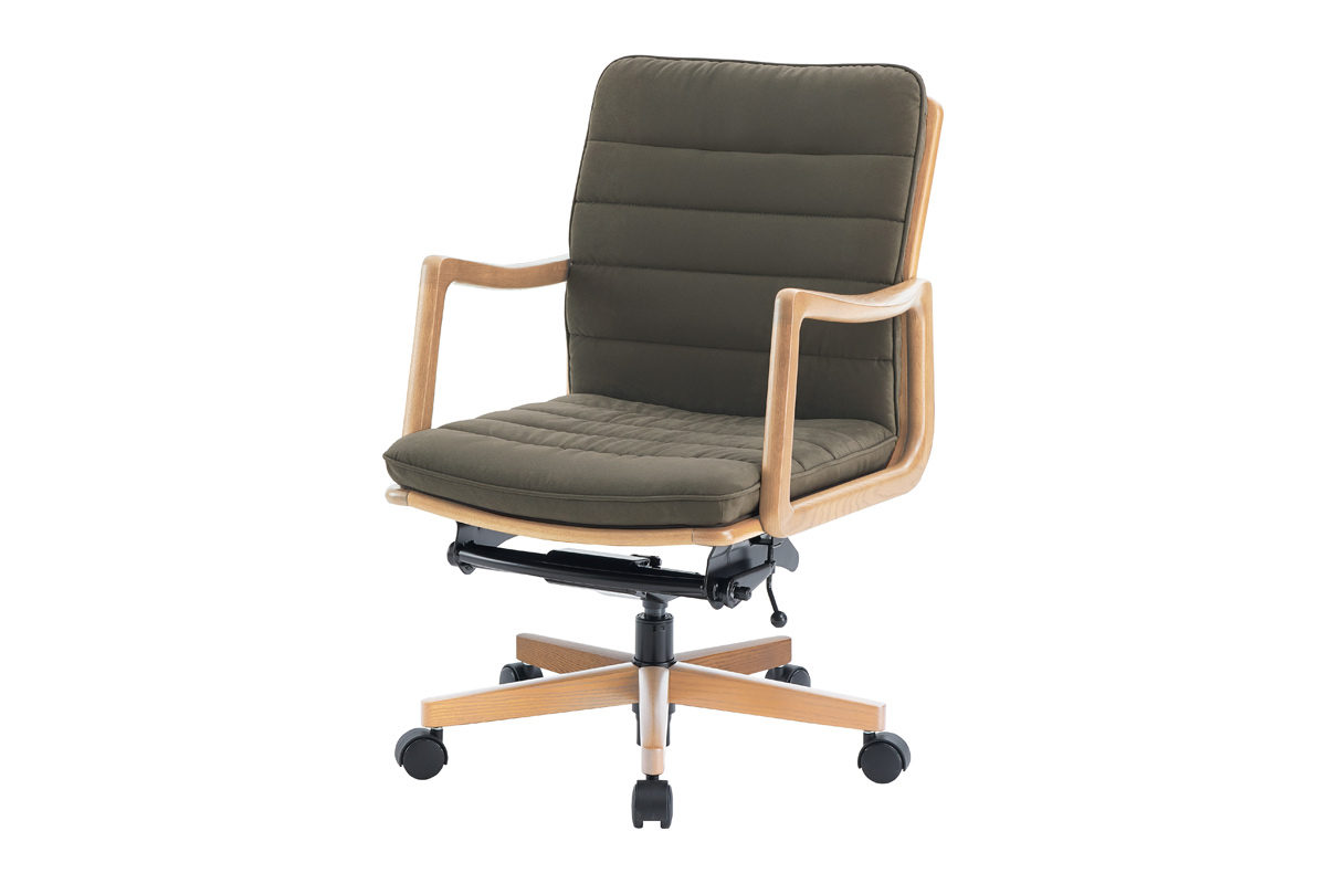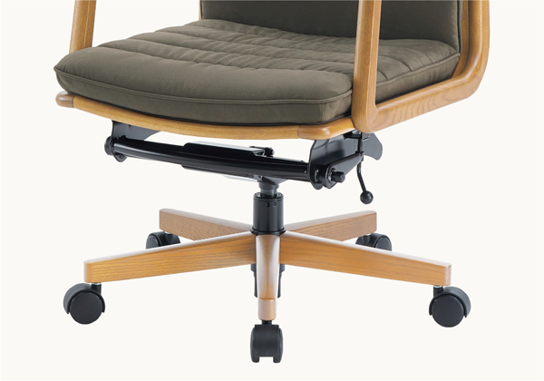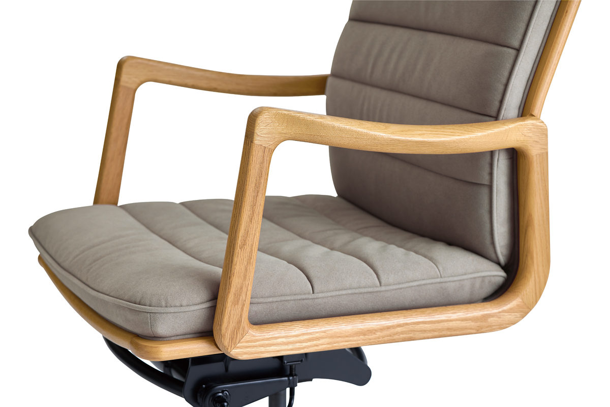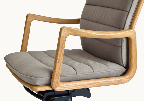 曲線を組み合わせてつくったデザインは、高級感がありながらも、やわらかな印象をワークスペースにもたらします。良質なオーク無垢材を採用した肘木は、いつまでも触れていたくなるような質感で、腕に馴染みやすいように設計。アームに腕を置いた際にすっと肩の力が抜け、心地よい寛ぎを感じていただけます。また、クッション部分の凹凸は、デザイン性と機能性を兼ね備えたもの。凹凸があることで滑りにくく、安定した座り心地が得られます。