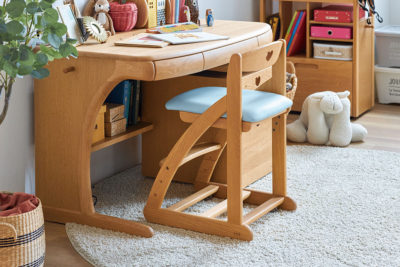 背もたれ部分にアクセントを施した、やわらかな印象のデスクチェアです。座面は4段階の高さ調節と前後スライド調節ができるので、成長に即した最適な着座姿勢が保てます。また、お子さまでも動かしやすいようにキャスターを採用しました。座るとキャスターが沈み込む安心設計で、動かなくなるため集中力が削がれる心配もありません。