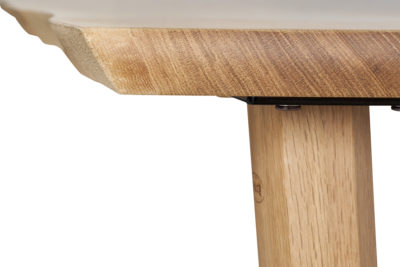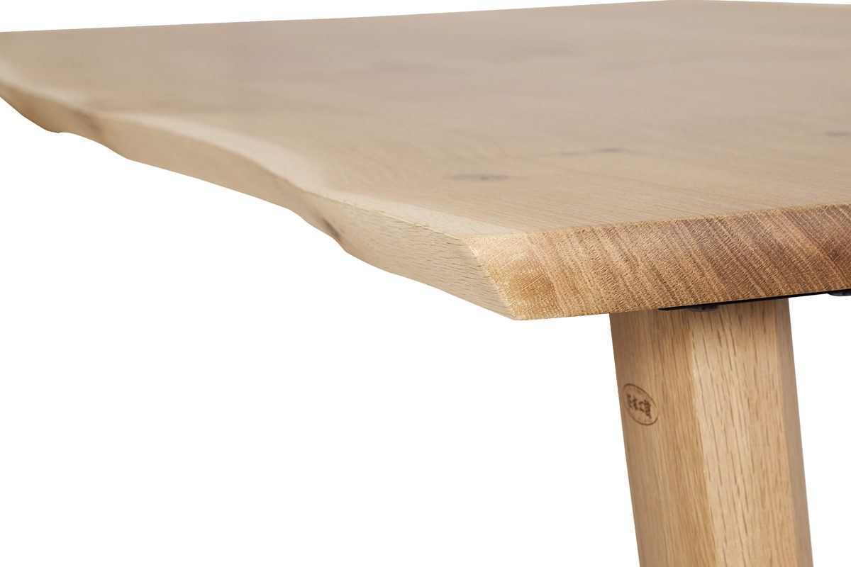 フランスで育った最高級オークを採用。その中でも希少価値の高い『300mm前後の幅広板』でつくった3枚ハギ天板です。厚さ33mmの重厚な天板の表裏両面には、傷や熱に強いUV塗装を施しました。天然木ならではの質感を残しつつ、日常使いできる機能性と耐久性も兼ね備えたダイニングテーブルです。