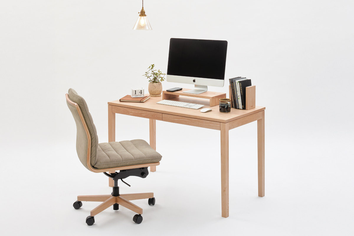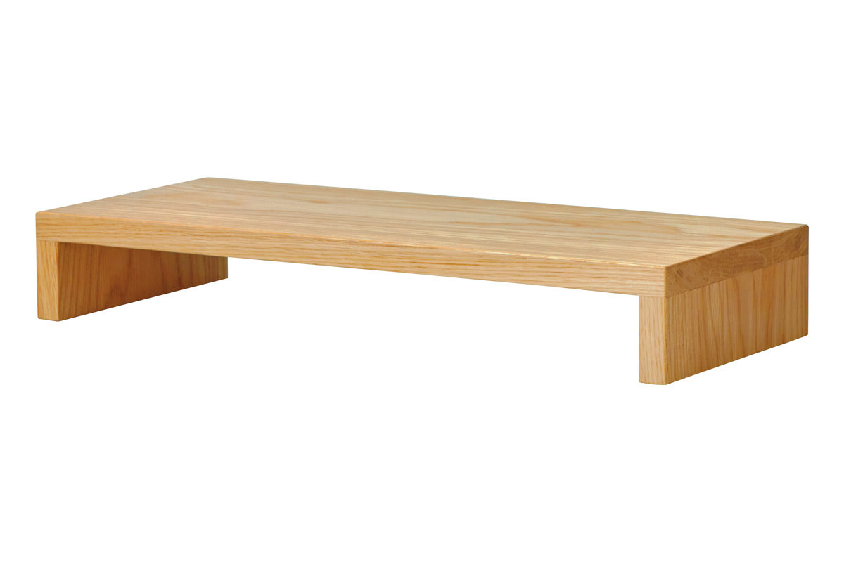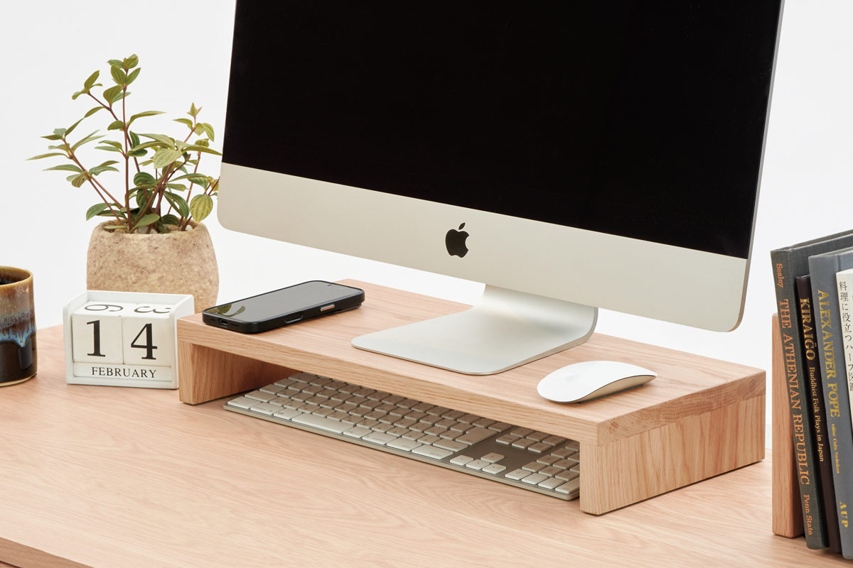 モニターの高さを適切に整え、快適なデスクワークをサポートする1000モニタースタンド。スタンド下にはキーボードをすっきり収納でき、デスクまわりを広く使えます。シンプルなフォルムと木のやさしい質感が、ワークスペースに心地よく調和します。