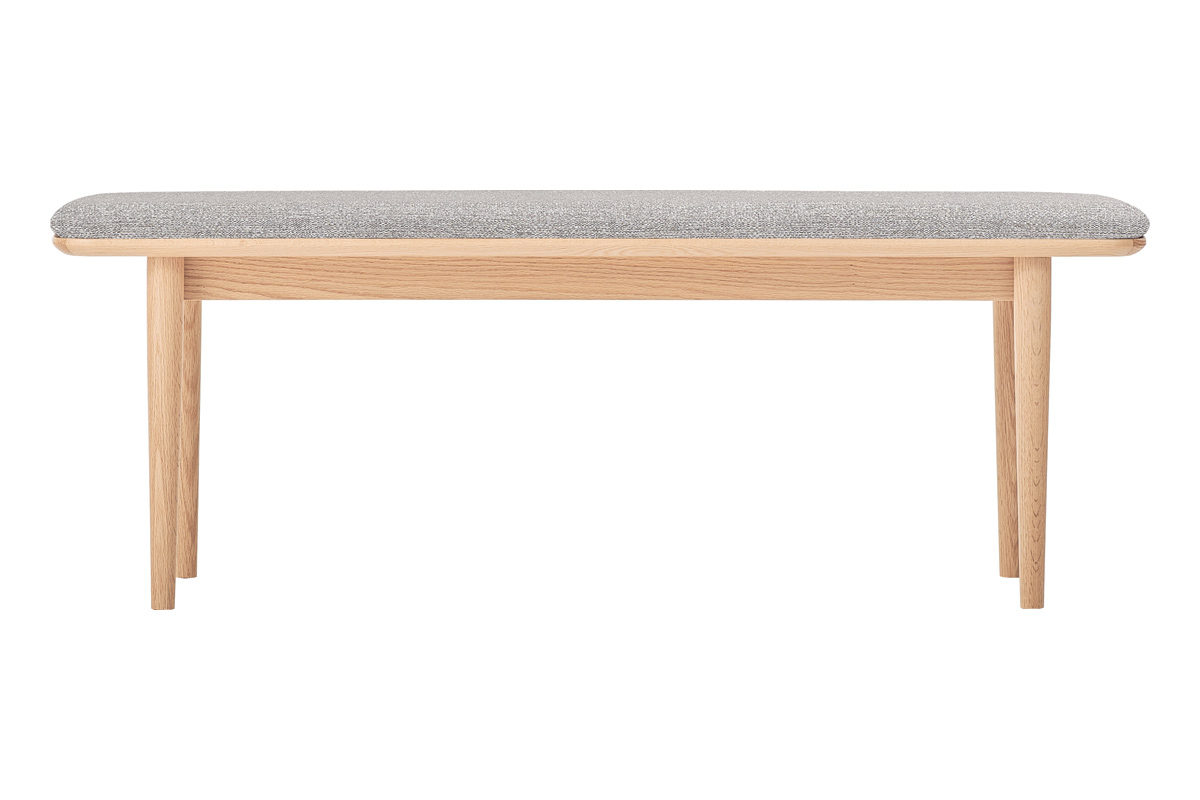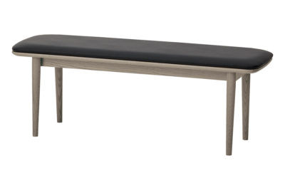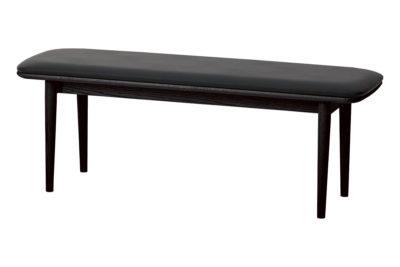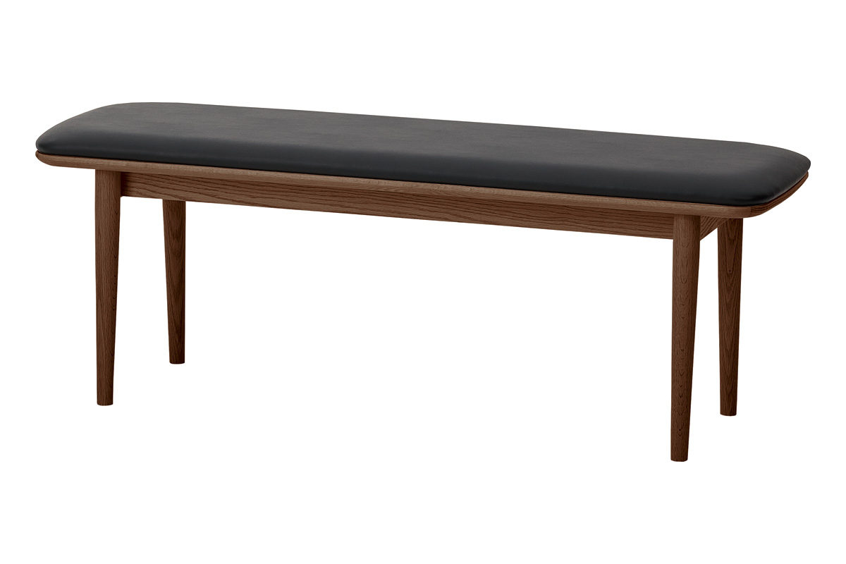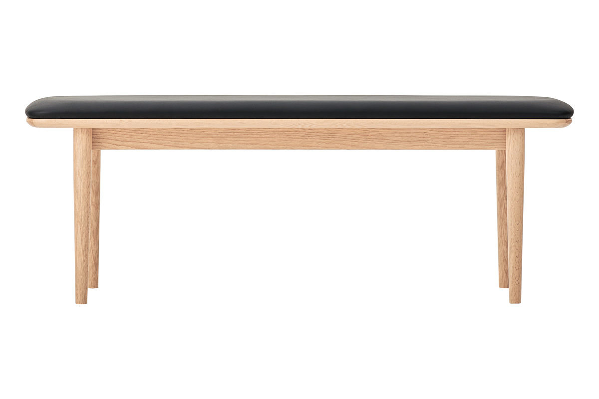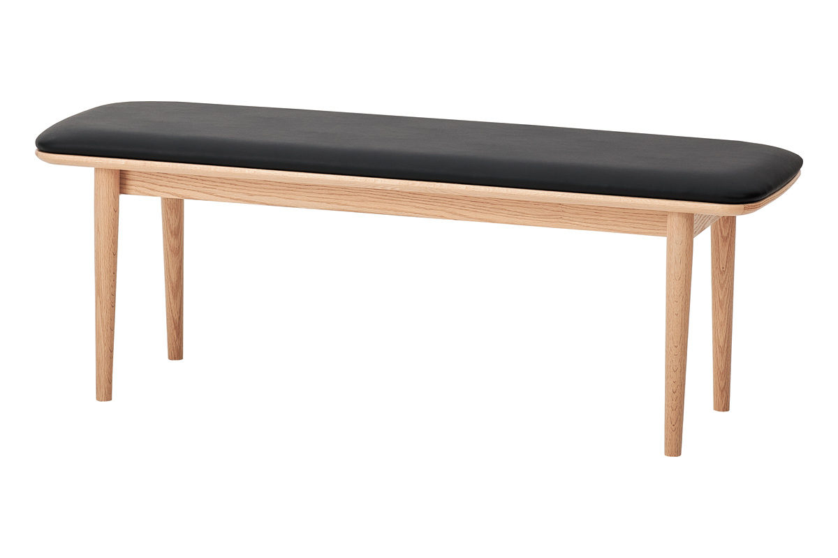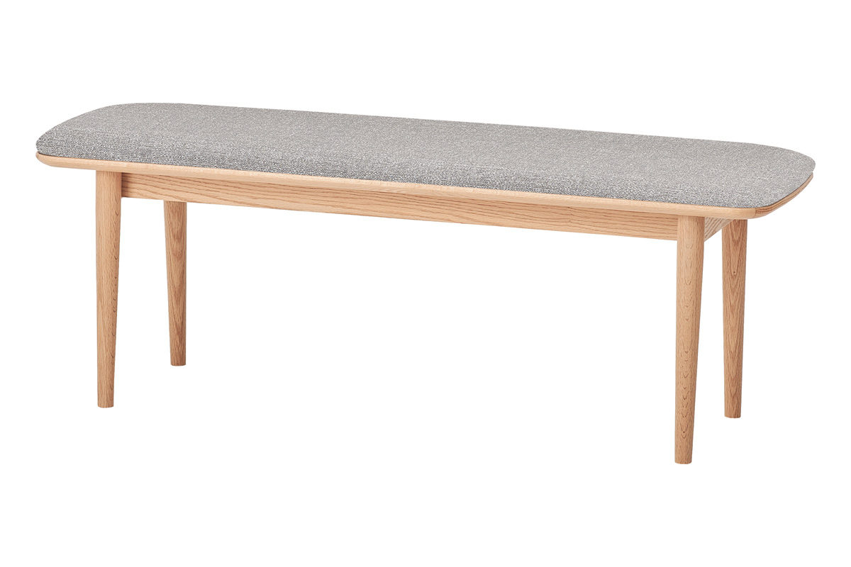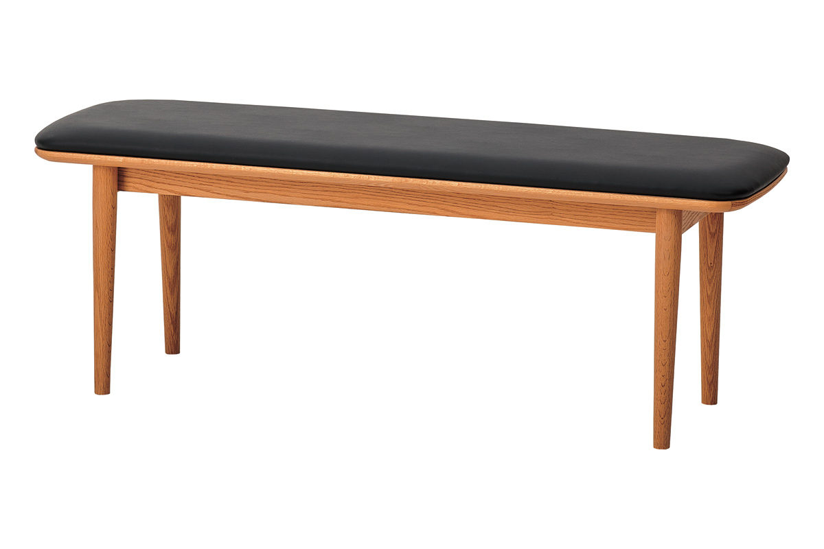 背もたれのないすっきりとしたデザインで、空間を広く見せます。出入りがしやすく、ダイニングテーブルとの組み合わせはもちろん、壁付けやカウンター下などさまざまなレイアウトに対応します。全体はゆるやかな曲線のシルエットで統一し、脚部にはテーパー加工を施すことで軽やかな印象に仕上げました。また、座面にはクッションと合板の接着部分に約3mmの面取り加工を施し、横から見た際にもシャープで美しい曲線が際立ちます。