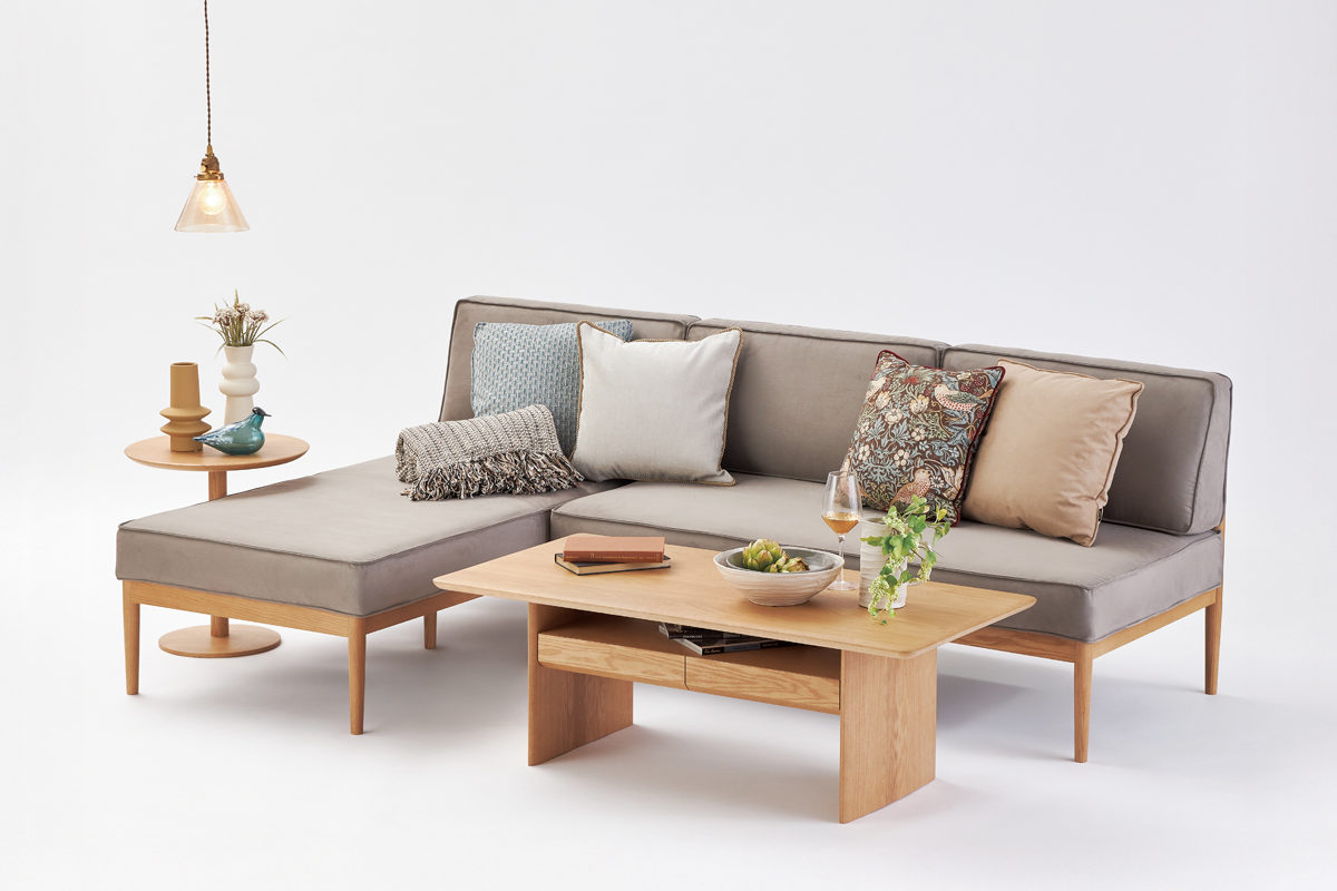 肘なし・肘つきソファを単体で使うことはもちろん、片肘のソファと組み合わせることでL字のコーナーソファに。カウチと組み合わせるとシェーズロングソファに