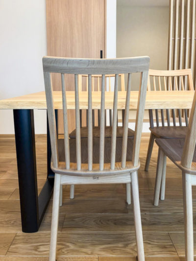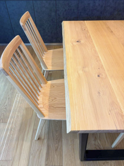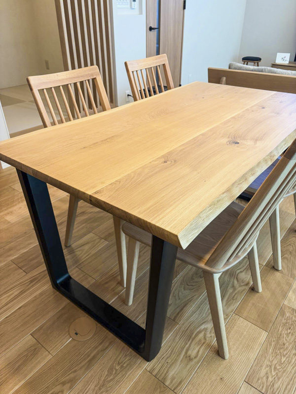新築を機にダイニングテーブルを探していた際、浜本工芸さんのこちらの製品に出会いました。節入りフランス産オークのダイナミックさと木の質感を感じられる耳付きのデザインに一目惚れ。脚も木材でできている製品が他になく、かっこよさと木の温かみを両立してくれています。実際に使ってみて、天板は拭き取るだけで汚れが落ちるのでとてもお掃除がしやすいと感じます。組み合わせたチェアはクッションを付けずあえて板座にしましたが、体にピッタリフィットしてずっと座っていたくなる心地よさ。家族団欒の中心になる場所で、このダイニングセットを長く大切に使っていきたいです。